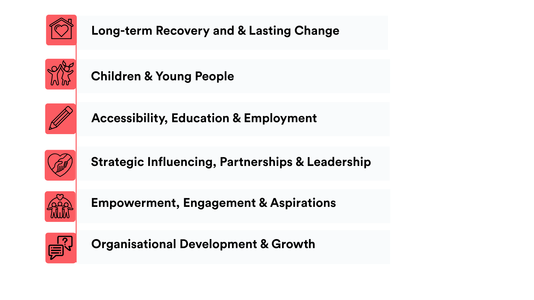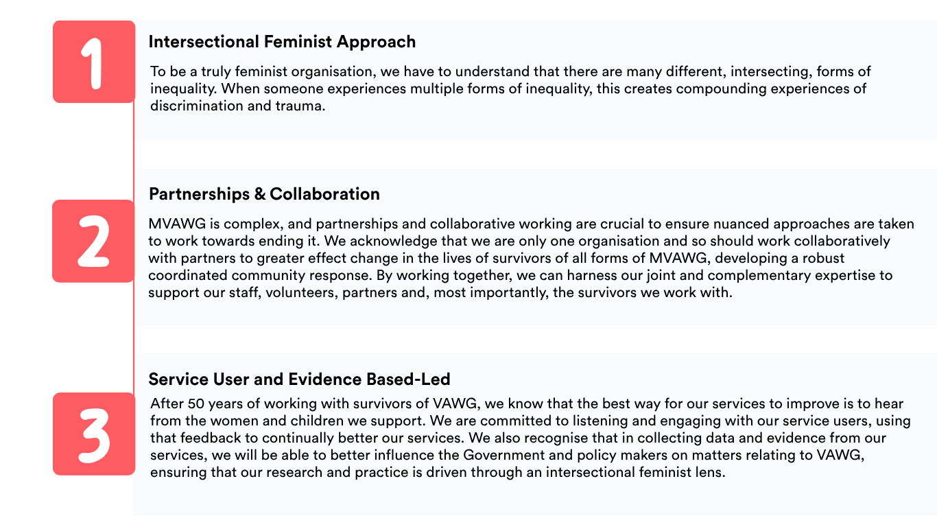 We have identified three key principles which underpin our strategic approach, and all our specialist work at Solace. The principles are interlinked and interdependent and work towards driving forward our ambitions of a world that is free from all forms of violence and abuse. The principles drive how we work as an organisation but also everything we do: